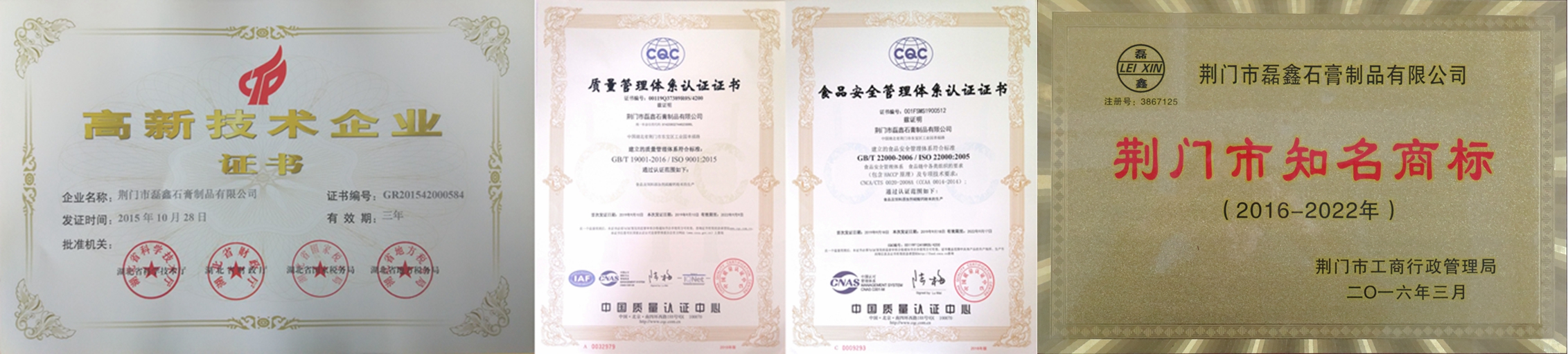 國家高新技術(shù)企業(yè)!湖北省專精特新中小企業(yè)!湖北省支柱產(chǎn)業(yè)細(xì)分領(lǐng)域隱形冠軍培育企業(yè)!湖北省守合同重信用企業(yè)!湖北省兩化融合示范企業(yè)!荊門市知名商標(biāo)!中國高純、高白、高亮、超細(xì)硫酸鈣(石膏)生產(chǎn)基地!中國取得《食品生產(chǎn)許可證》的食品添加劑硫酸鈣(石膏)供應(yīng)商!中國取得《飼料添加劑生產(chǎn)許可證》和《產(chǎn)品批準(zhǔn)文號》硫酸鈣供應(yīng)商!中國取得《出口飼料生產(chǎn)、加工、存放企業(yè)檢驗(yàn)檢疫注冊登記證》飼料添加劑硫酸鈣供應(yīng)商!通過ISO9001國際質(zhì)量管理體系認(rèn)證!通過ISO22000國際食品安全管理體系認(rèn)證!通過HALAL國際清真認(rèn)證!通過KOSHER猶太認(rèn)證! 荊門市磊鑫石膏制品有限公司成立于2002年,位于石膏資源富集的湖北省荊門市東寶區(qū)工業(yè)園幸福路,占地27000余平方米,是一家在業(yè)內(nèi)享有盛譽(yù)的集石膏、石膏粉和硫酸鈣制品研發(fā)、生產(chǎn)、銷售于一體的高新技術(shù)企業(yè)。公司擁有 “磊鑫”、“杰普生”、“凱氏蘇特”等5個(gè)國家注冊商標(biāo),2個(gè)發(fā)明專利,18個(gè)實(shí)用新型專利,50余篇自有技術(shù)應(yīng)用研究,36篇權(quán)威期刊發(fā)表技術(shù)論文。主要產(chǎn)品有:醫(yī)藥級硫酸鈣、食品級硫酸鈣、飼料添加劑硫酸鈣、人造石透明填充粉,凱色粉、涂料及化妝品功能性填料和特級半水纖膏粉、混合石膏粉、模型石膏粉,建筑石膏粉等九大系列50余種產(chǎn)品。公司享有自營進(jìn)出口權(quán),客戶遍布全世界,是多家公司、集團(tuán)和世界500強(qiáng)企業(yè)的優(yōu)秀供應(yīng)商!產(chǎn)品遠(yuǎn)銷到韓國、日本、俄羅斯、中國臺灣、東南亞、歐美、中東、非洲等國家和地區(qū)。公司緊靠207國道,焦柳鐵路穿境而過,距漢江碼頭50公里,長江沙市港90公里。交通運(yùn)輸便利,確保及時(shí)供貨?!按脩魹樯系壅\信為本,視質(zhì)量為生命持之以恒!”是我們的企業(yè)宗旨,與我們合作是您明智的選擇,共謀發(fā)展是我們共同的目標(biāo)!歡迎垂詢,歡迎惠顧! Your Trusted Source For Food-Grade Calcium Sulfate!——做全球更好的食品級硫酸鈣(石膏)供應(yīng)商! ——CGC·磊鑫石膏